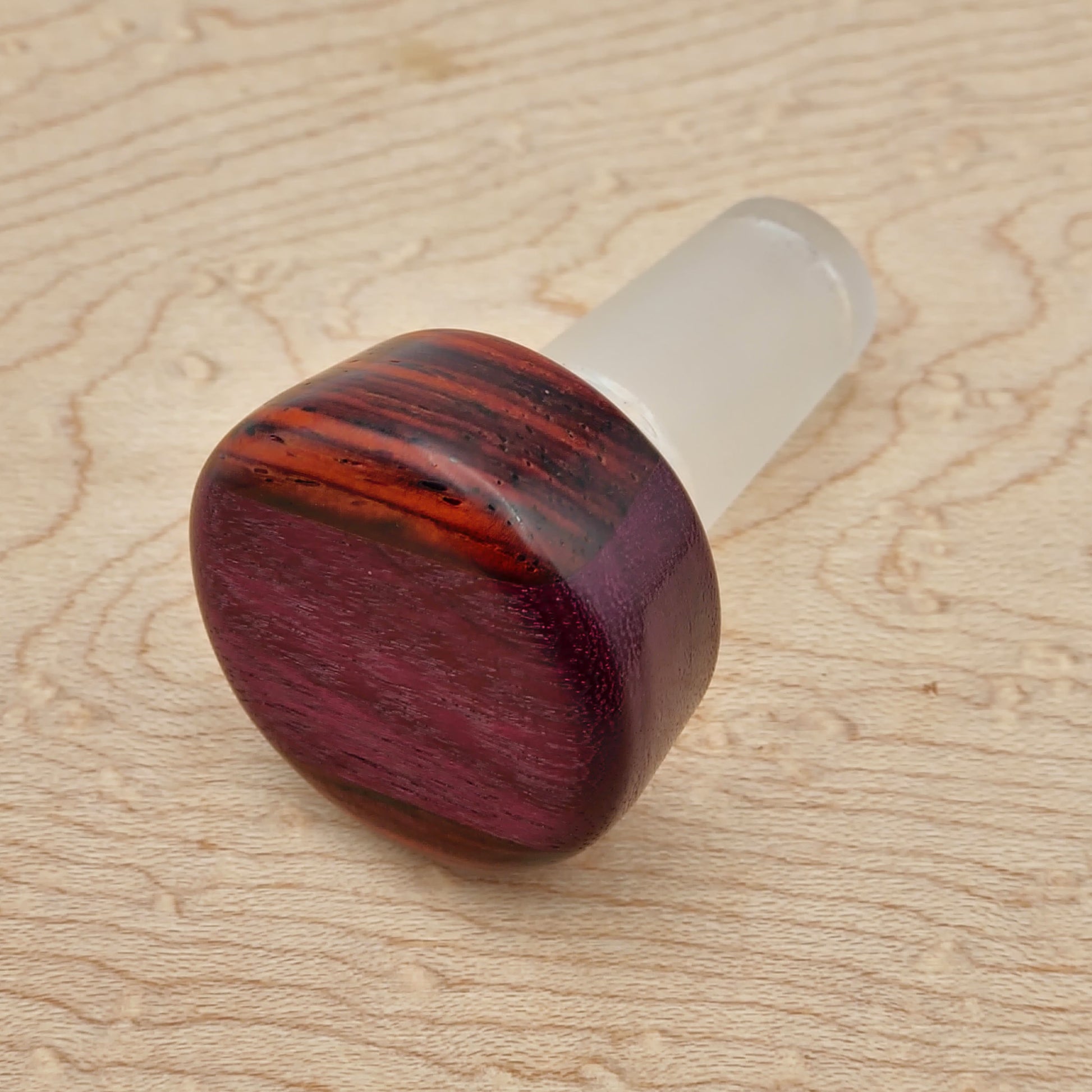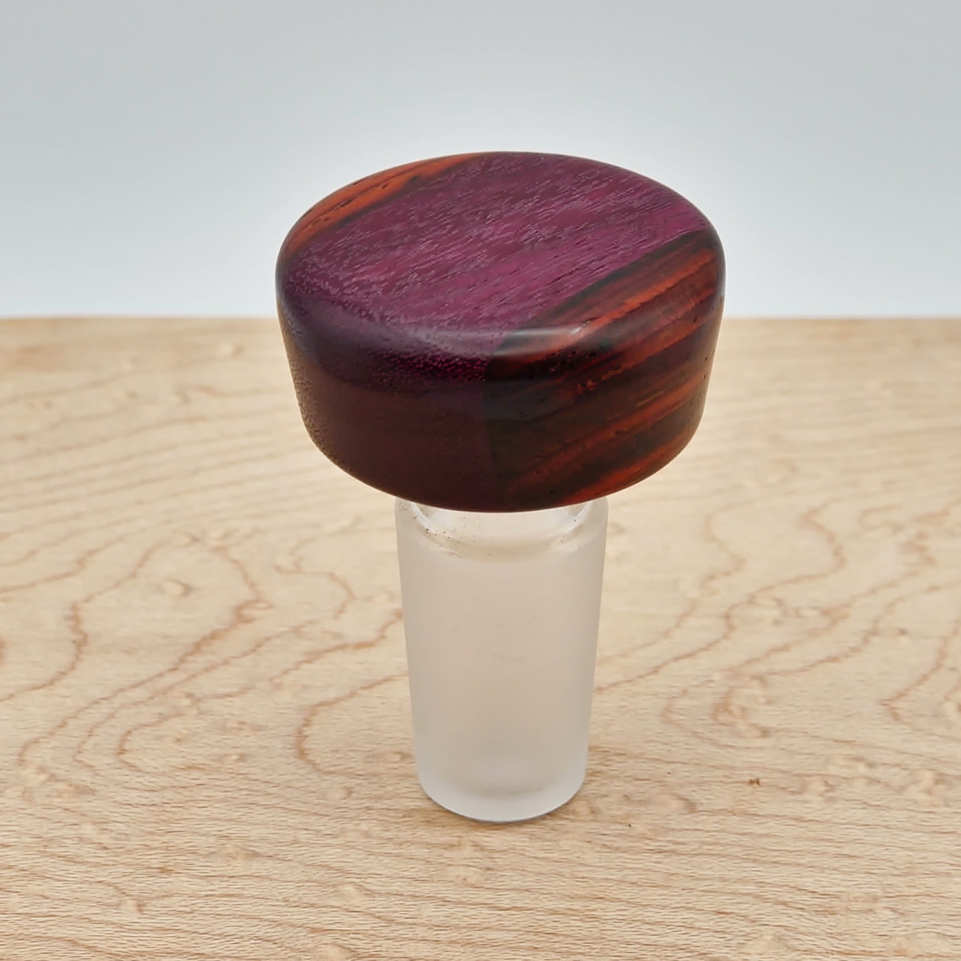 Made with Cocobolo and Purpleheart combined with a glass plug. This is a 14mm plug or stopper for your pass-through or carb hole in your glass.